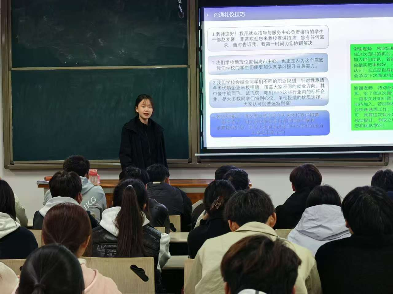 在培训环节,2022级学生代表赵梦馨围绕部门业务实操、大学生职业规划、面试礼仪与前期准备、求职经验分享四个方面,结合自身工作经历和典型案例,深入浅出地讲解了就业指导中的实用技巧,为新成员提供了丰富的实践参考,有效拓展了工作思路。随后,其他三位学生代表也依次分享了各自的求职准备历程与实战经验,详细介绍了在专业学习、技能提升、实习实践等方面的规划与具体做法,为新成员开展就业指导工作提供了生动借鉴。