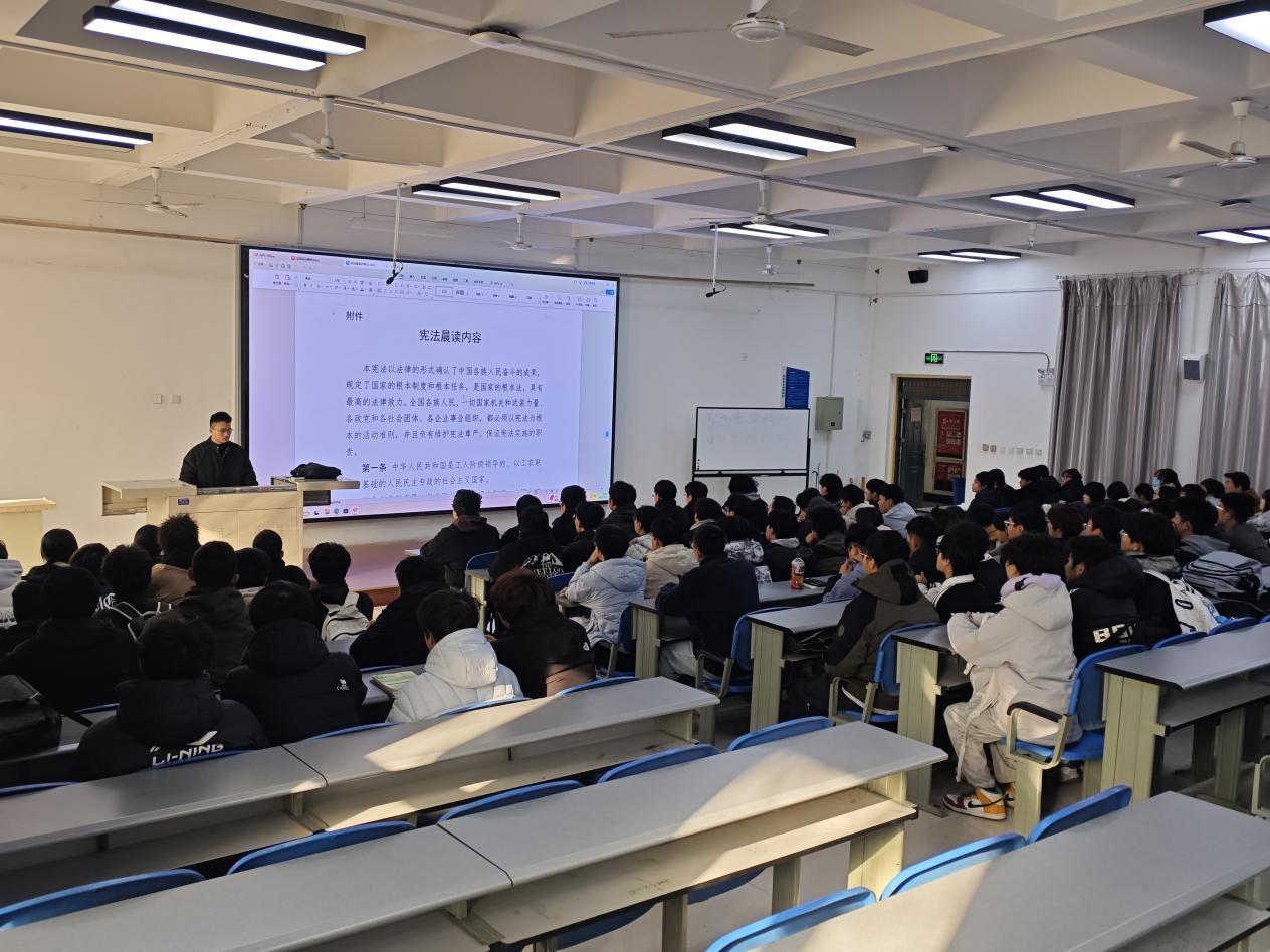 2025年12月4日,是我国第十二个国家宪法日。为深入学习贯彻习近平法治思想,进一步增强青年学子的法治观念与宪法意识,太阳成集团tyc1286积极响应号召,于当日上午组织大一学生齐聚阶梯四,根据教育厅《关于开展2025年陕西省教育系统“宪法晨读”活动的通知》,在庄严氛围中开启了一堂生动而深刻的宪法教育课。